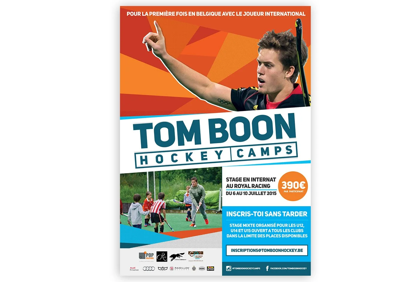 Création de l’identité graphique de la marque Tom Boon Hockey Camps. En collaboration avec l’équipe de Tom Boon représenté par Lucas Demot, le logo est utilisé sur toutes les communications, baches, drapeaux et éléments liés aux stages de hockey sur gazon en Belgique et à l’international.